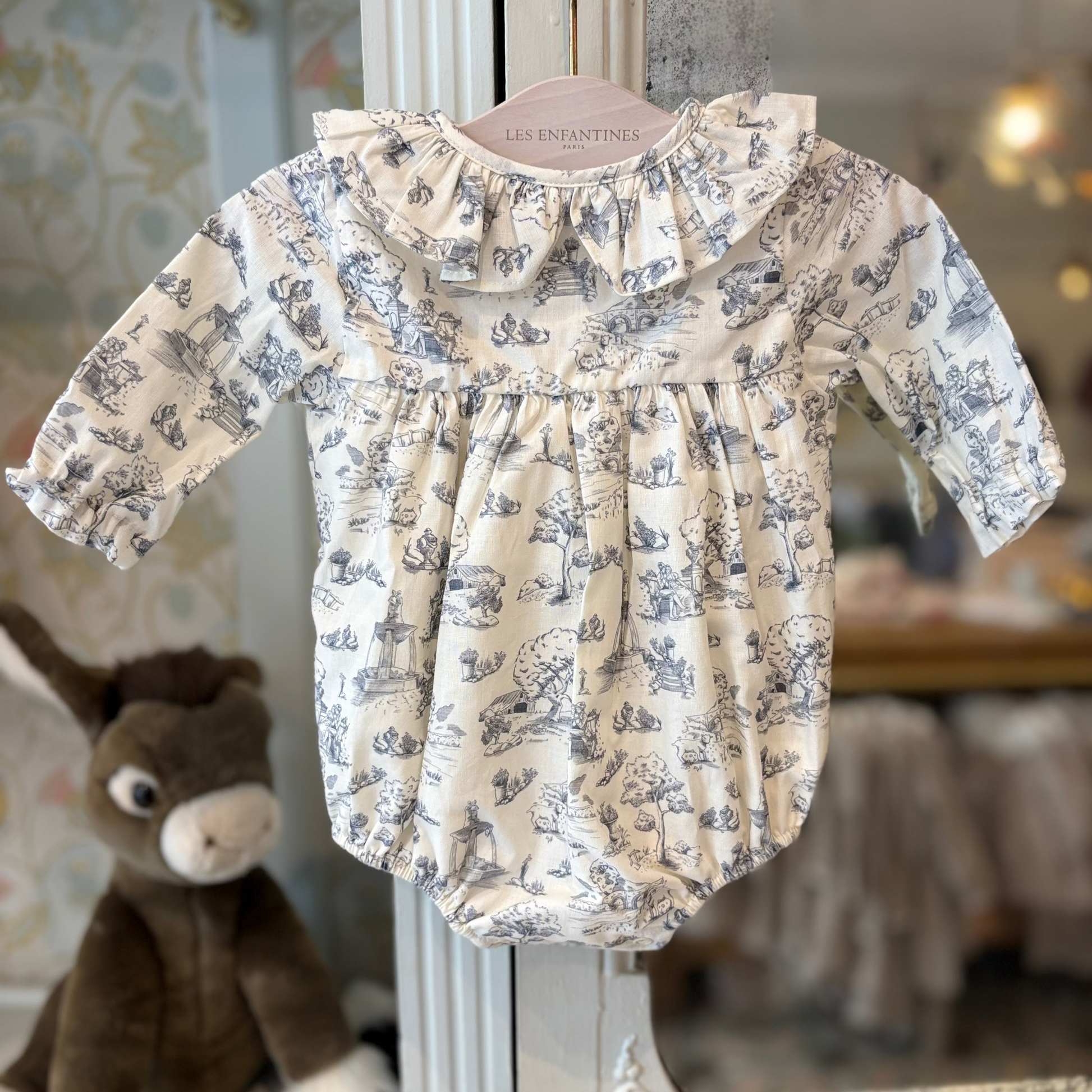 Cette barboteuse est chaude, ultra-moelleuse, et surtout poétique, couverte des petits dessins dans l'esprit de la toile de Jouy.