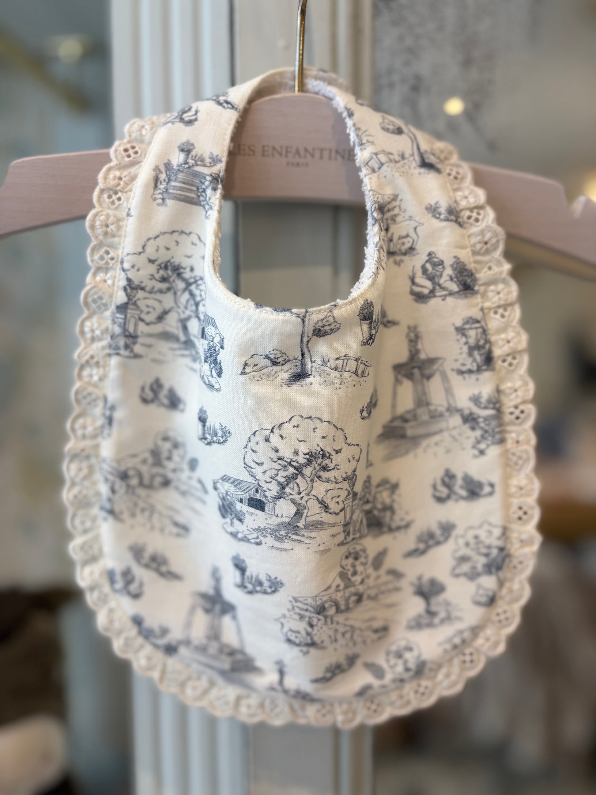 Un bavoir délicatement bordé de dentelle, dans notre imprimé « Mouton à la Maison » d'inspiration Toile de Jouy.